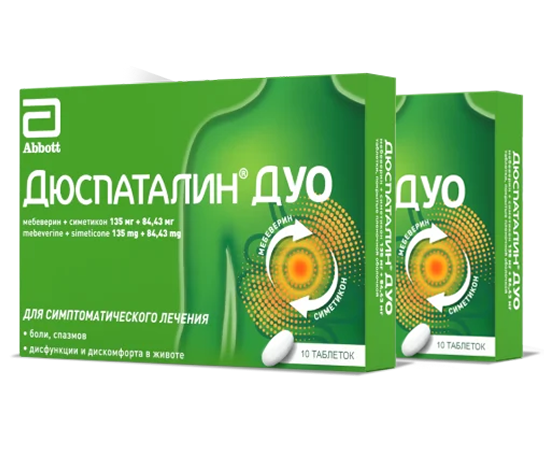 Дюспаталин® ДУО — это комбинированный препарат, в состав которого входят следующие действующие вещества — мебеверин и симетикон.